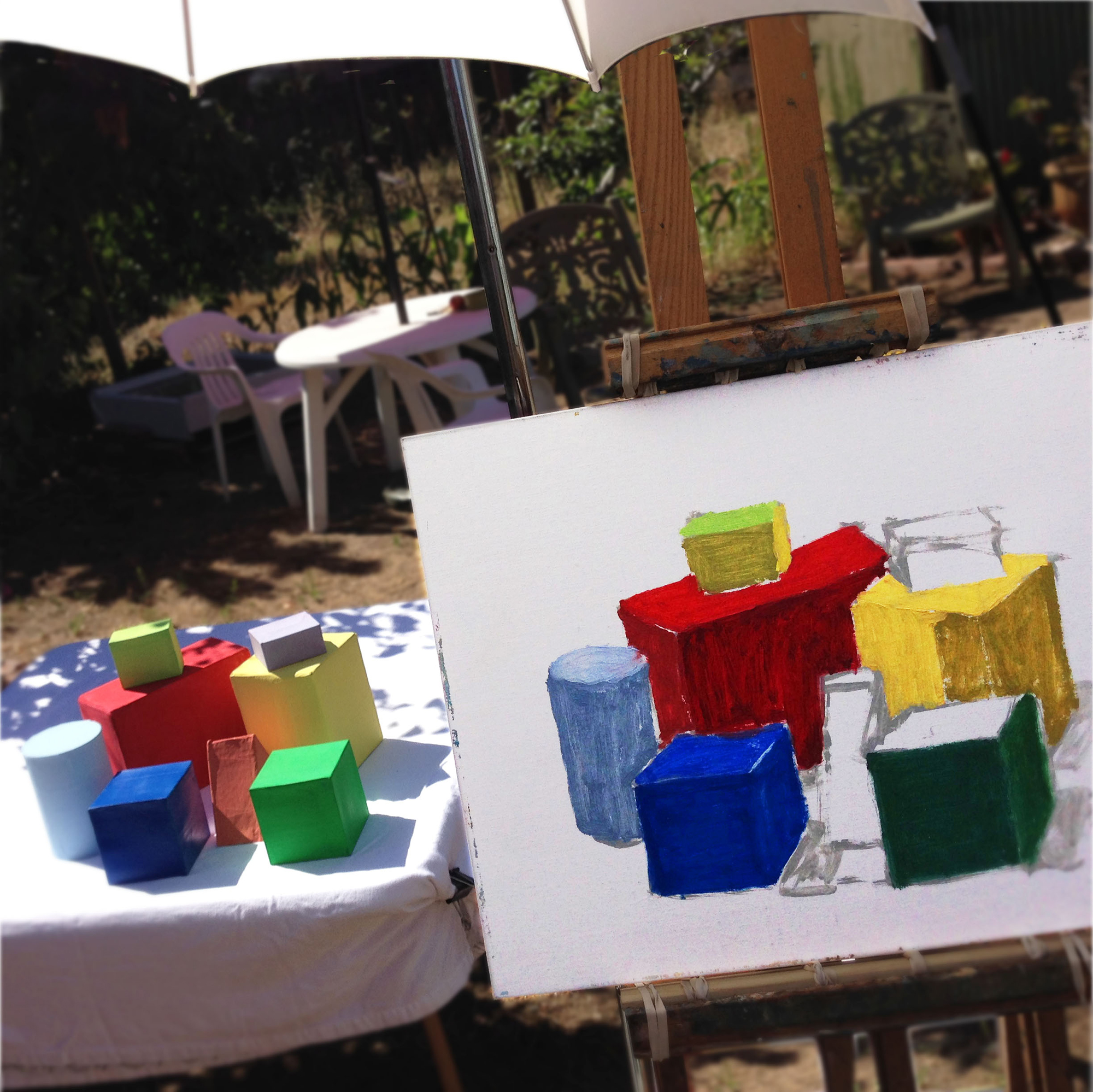 Setup outside for a study of color blocks on a table
