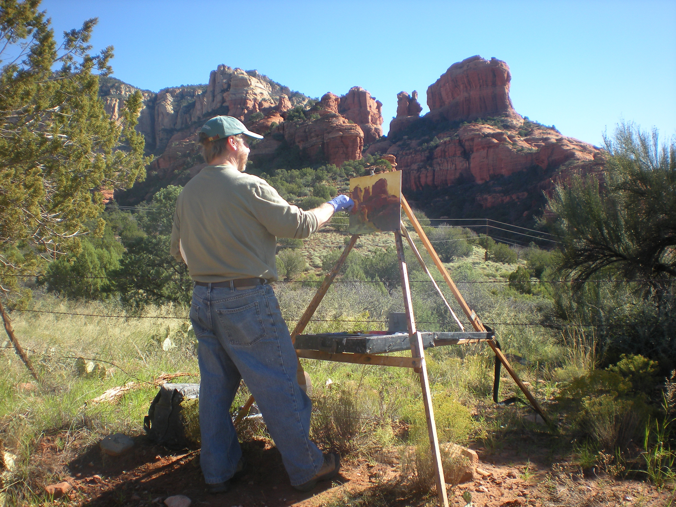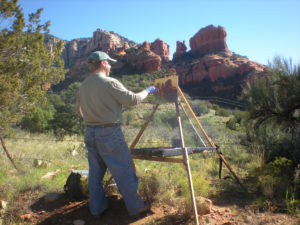 David Lussier painting with a Gloucester-style easel in Sedona, Arizona. Note that although he is painting a small canvas, the gloucester’s design allows it to hold huge canvases for plein air painting large on location.