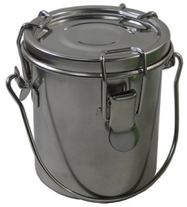 Stainless steel with removable screen insert. Three clamps insure the lid is completely leak-proof. Bonus: includes an extra gasket! dimensions: 3 1/2″ h x 3 1/4″ w. Capacity: 10 fluid oz. Weighs only 7.3 Oz. Find it on Amazon.